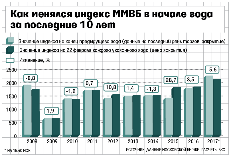 Индекс ММВБ показал худшую динамику начала года за последние девять лет, говорится в обзоре «БКСэкспресса», который рассматривает период с января по 22 февраля. За этот период значение индекса снизилось на 5,6% по сравнению с итогами 2016 г., подсчитал стратег БКС Максим Шеин. За последние 10 лет худший результат индекс ММВБ показывал только в 2008 г., когда он снизился на 8,8%.